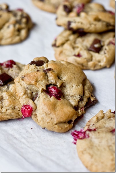 I have to tell you, these cookies surprised me! They are so much better than I even expected. Tart cranberries, rich dark chocolate (a lot of it) and chewy brown butter cookie dough work together pretty perfectly.