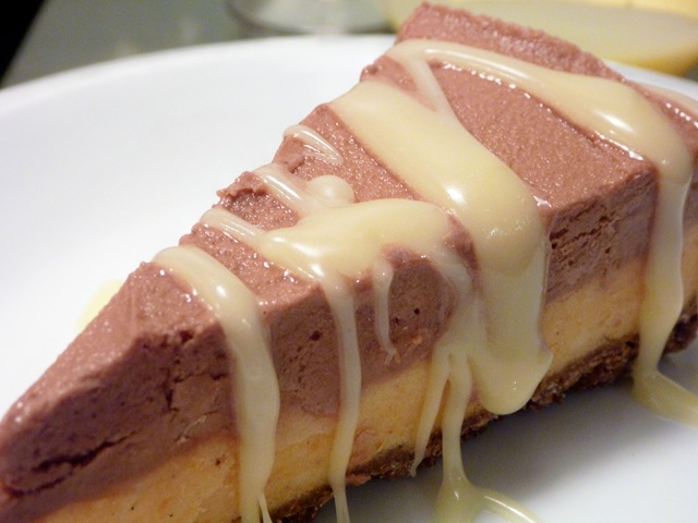 You are looking at layers of crunchy gingersnap crust, pumpkin frozen yogurt, and chocolate frozen yogurt topped with a salted caramel cream sauce. I came up with the dessert because chocolate and pumpkin are some of my favorite flavors, but as soon as I created it I realized that this mimics my favorite cheesecake bar. Ok, so it wasn’t the first time using these flavors, but I promise that it was worth the lack of creativity for an excuse to make the topping. This Frozen Pumpkin and Chocolate Yogurt Pie with Salted Caramel Cream Sauce was a very worthy end to 2010.
