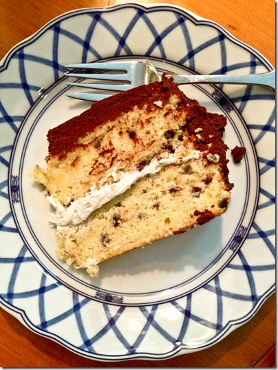 Since it was Mother’s Day, I knew the cake needed plenty of chocolate.  The moist and dense (perfect pound cake texture!) cake layers were filled with chocolate chips and the outside was covered with a rich whipped chocolate ganache.  The filling was vanilla buttercream.  I was actually experimenting with a shortening-based recipe, but next time I’d just use all butter or at least half butter instead.  Okay, now I am completely craving this cake again.