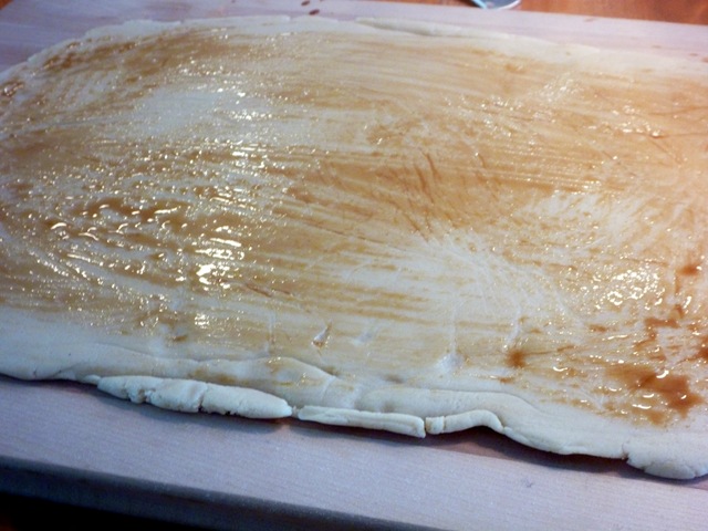 13. When dough is rolled like a long cinnamon bun, wrap tightly with seran and chill again in refrigerator for 1 hour