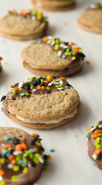 Chewy Graham Cracker flavored cookies filled with a toasted pumpkin marshmallow buttercream are the best cookie for fall! Dip them in chocolate and decorate with colored sprinkles for a festive treat.